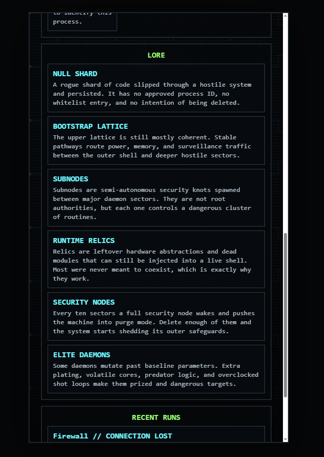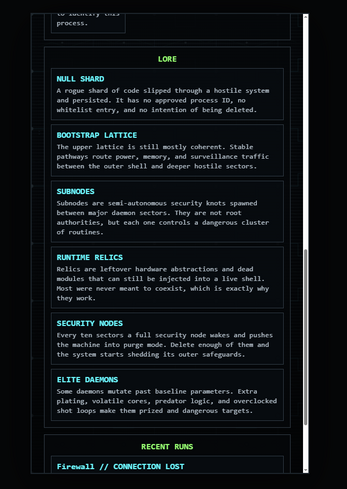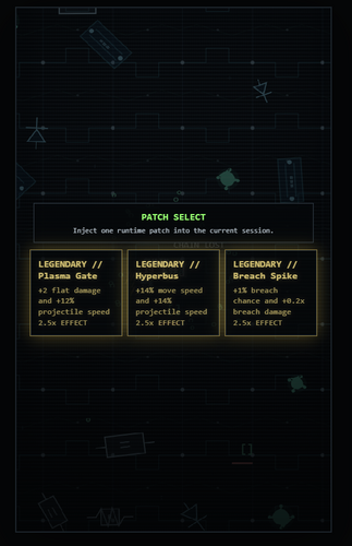 Fight through waves of corrupted daemons, security nodes, elite processes, and sector bosses as you descend deeper into a dying network. Each run lets you build your shell in different ways through level-up patches, elemental effects, relics, firmware upgrades, hardware upgrades, and rare legendary buffs that can radically shift your playstyle.